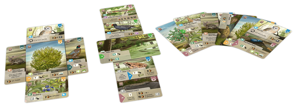 The game mechanism stays untouched: To start, each player has six cards in hand, with cards depicting either a particular type of tree, shrub or terrain or two moor dwellers (animal, plants), with these latter cards being divided in half, whether vertically or horizontally, with one dweller in each card half. On a turn, either draw two cards — whether face down from the deck or face up from the clearing — and add them to your hand, or play a card from your hand by discarding other cards to pay the cost, then putting that first card into play. In the end, the player with the highest score wins.