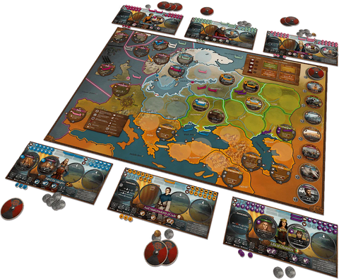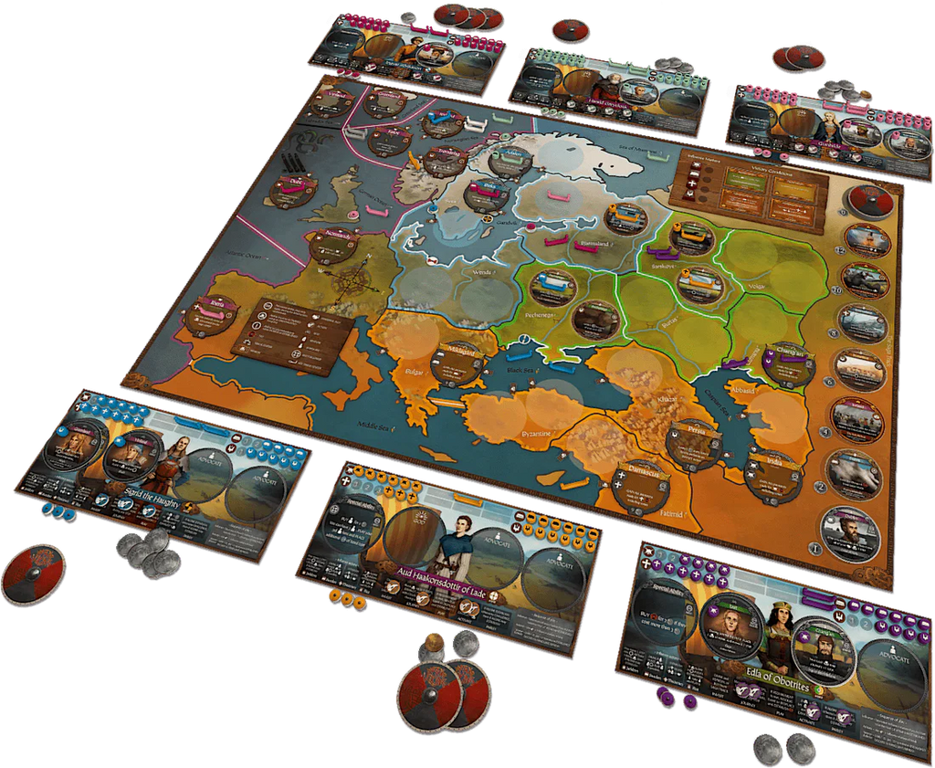 Pax VikingĀ is a historical strategy game of trade and diplomacy in the 10th century for 1-6 players. The game highlights those Vikings who travelled eastwards, towards the rich trade routes of Persia and around the Black Sea. Skilled opportunists in the matters of silver and axe, these Vikings are ready to wield whichever worked best in any given situation. They shared an adventurous explorer ethos with the westward travelling Vikings, and reached far to the south and east, forming strong alliances, influencing societies, and founding empires along their way.